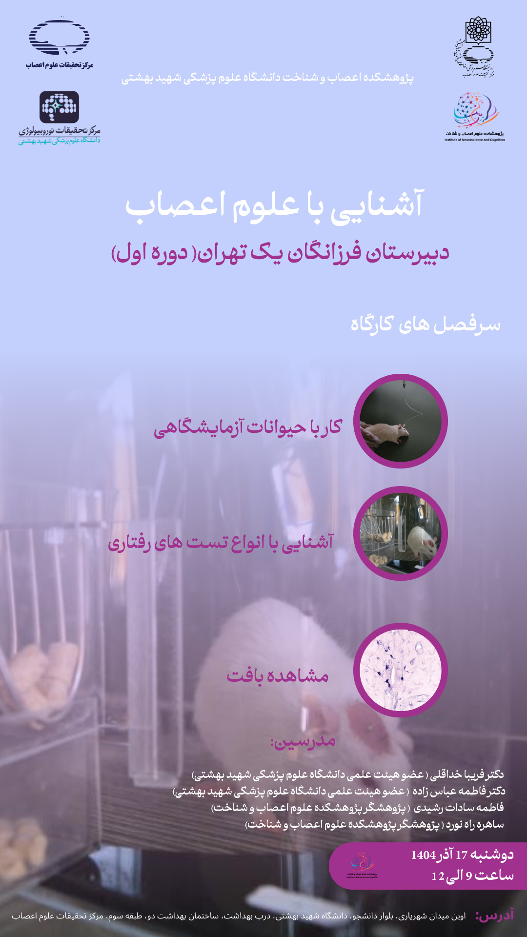 کارگاه آشنایی با علوم اعصاب برای دانش آموزان دبیرستان فرزانگان یک تهران (دوره اول) در تاریخ دوشنبه 17 آذرماه 1404 از ساعت 9 الی 12 برگزار می گردد.